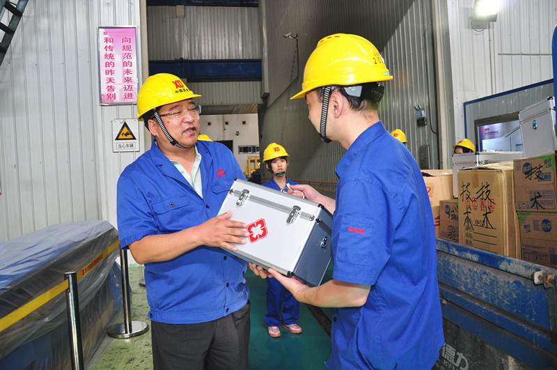 楊董事長和張書記走到一臺臺機床旁,與大干的工人們親切握手問好,把清涼飲品和毛巾送到員工手上。每到一個車間,就把裝有仁丹、防蟲藥、棉紗、創可貼的藥品箱鄭重交給車間負責同志,叮囑他們一定要關心職工身體健康,做好防暑降溫工作。領導們深入了解車間生產情況,現場解決實際困難。